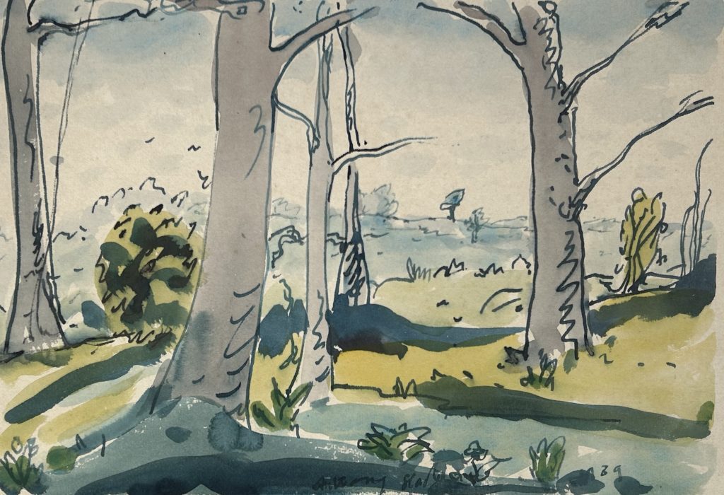 Signed watercolour on handmade paper. Image measures 26cm x 36.5cm. Conservation mounted. Condition: Laid down. Colours clear, unfaded. Light time toning.