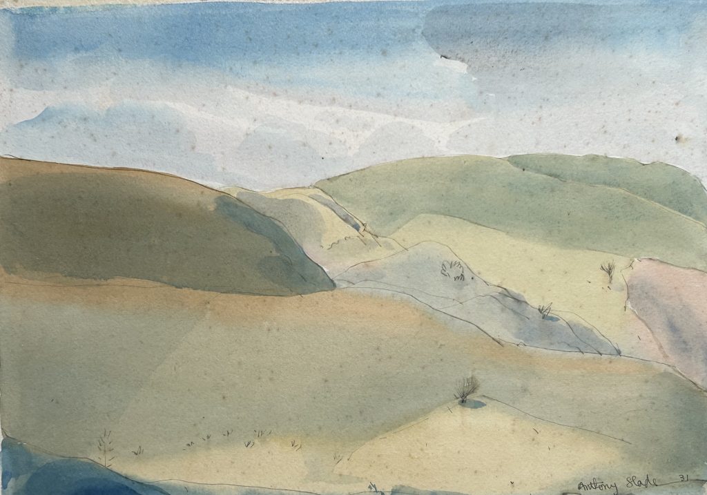 Signed watercolour on handmade paper. Image measures 26cm x 36.5cm. Conservation mounted. Condition: Laid down. Colours clear, unfaded. Light foxing to sky.