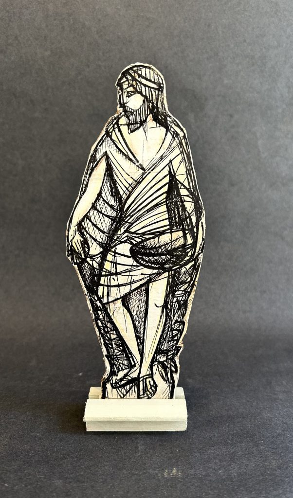 The ink preparatory, backed onto hardboard, intended to visualise the eventual carving. Note in Skelton’s hand verso, dating the work to 1956. Ink preparatory measures 20cm including wooden stand. Included with the Portland stone sculpture. Provenance: The studio of John Skelton.