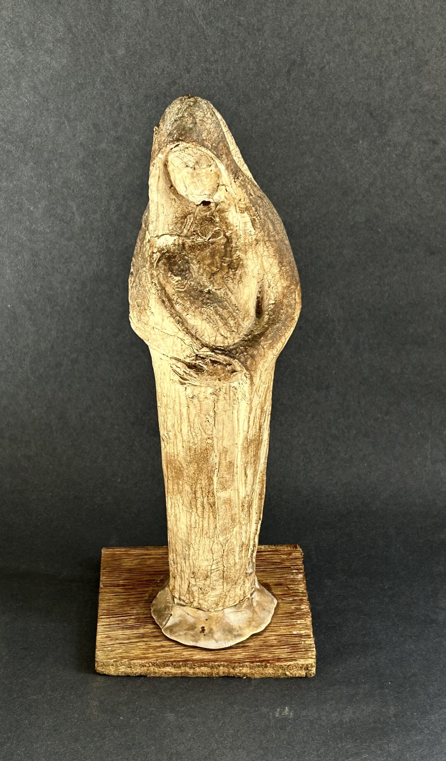 Carving in plaster (ie. the reduction through carving of a plaster block) Intentionally coloured. Possibly an initial idea for the composition of ‘Our Lady of Pity’ in Norwich Cathedral (1967-8) although the form and method would imply earlier (circa 1945 perhaps when Skelton was carving plaster by way of exploring technique). Measures 28cm high including original wood base. Repaired crack across right shoulder. Area of plaster lost to base at back. Provenance: The studio of John Skelton.