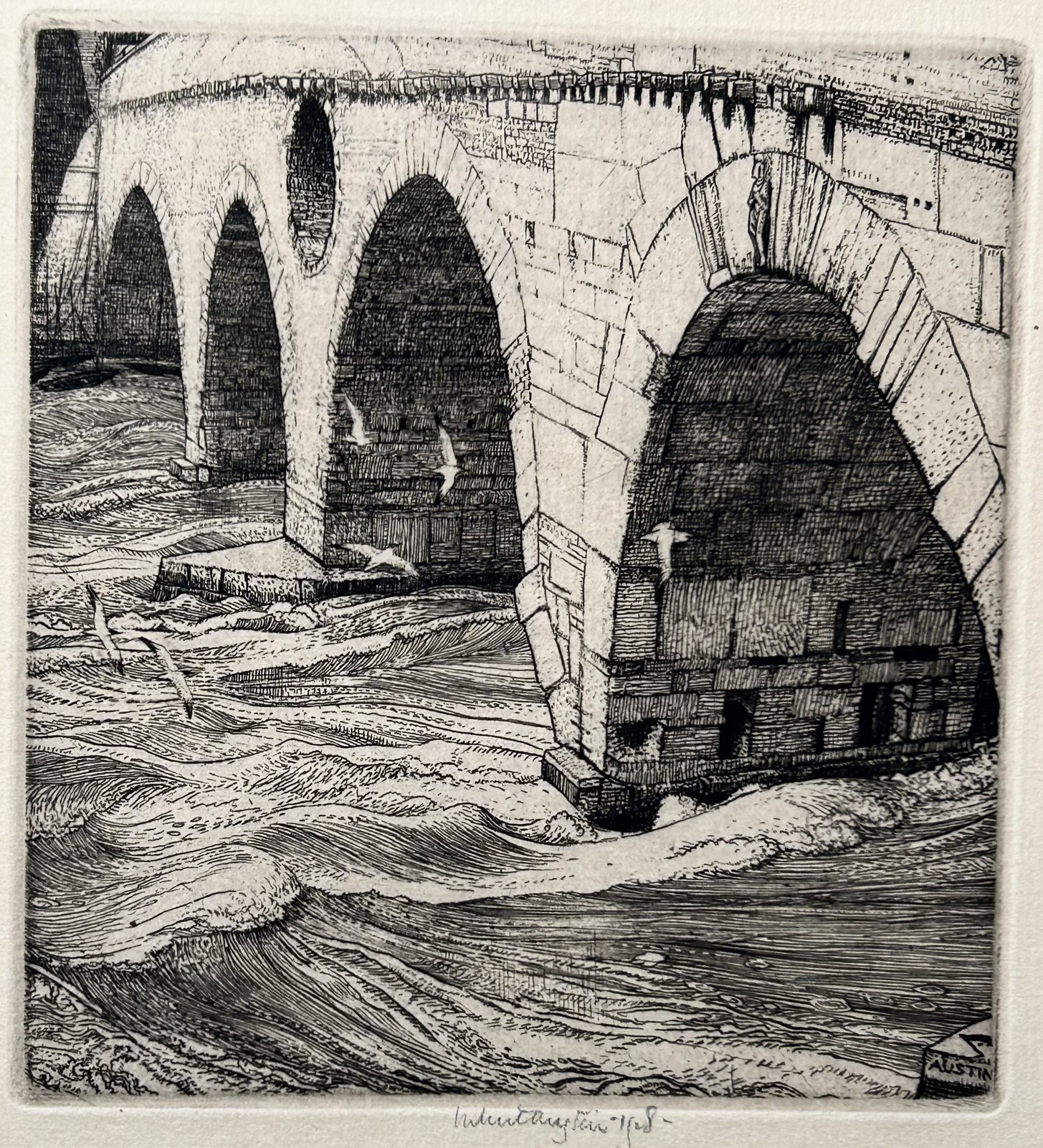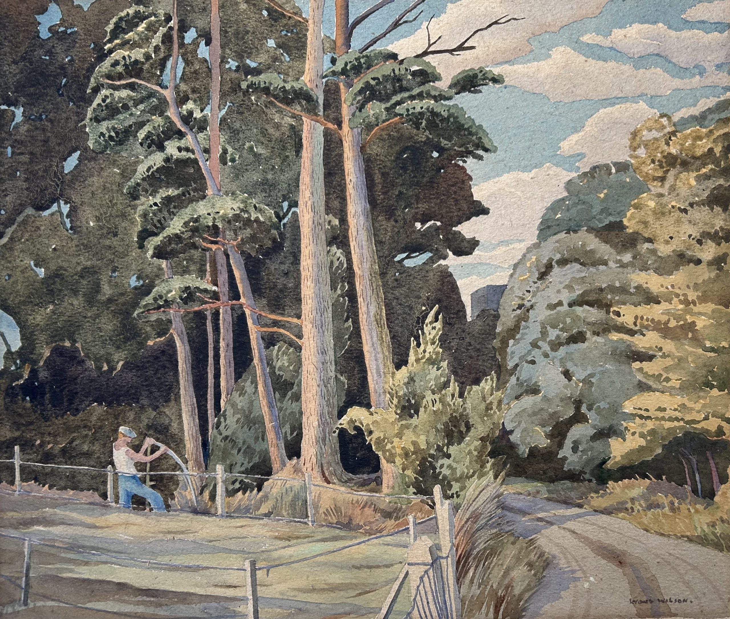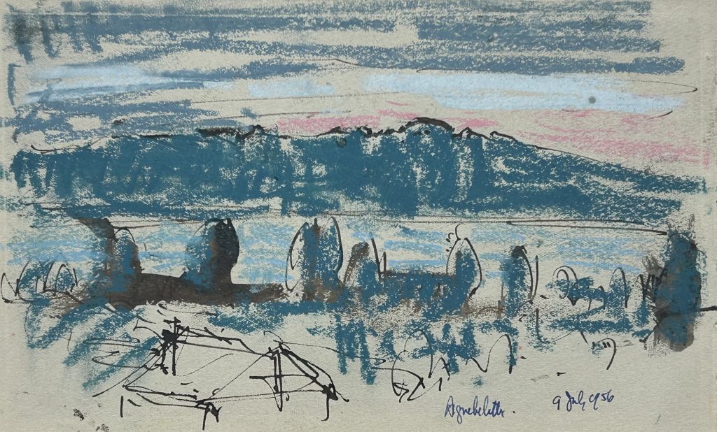 Pastel, inscribed with title and dated 9th July, 1956. Measures 13cm x 22.5cm. Conservation mounted.