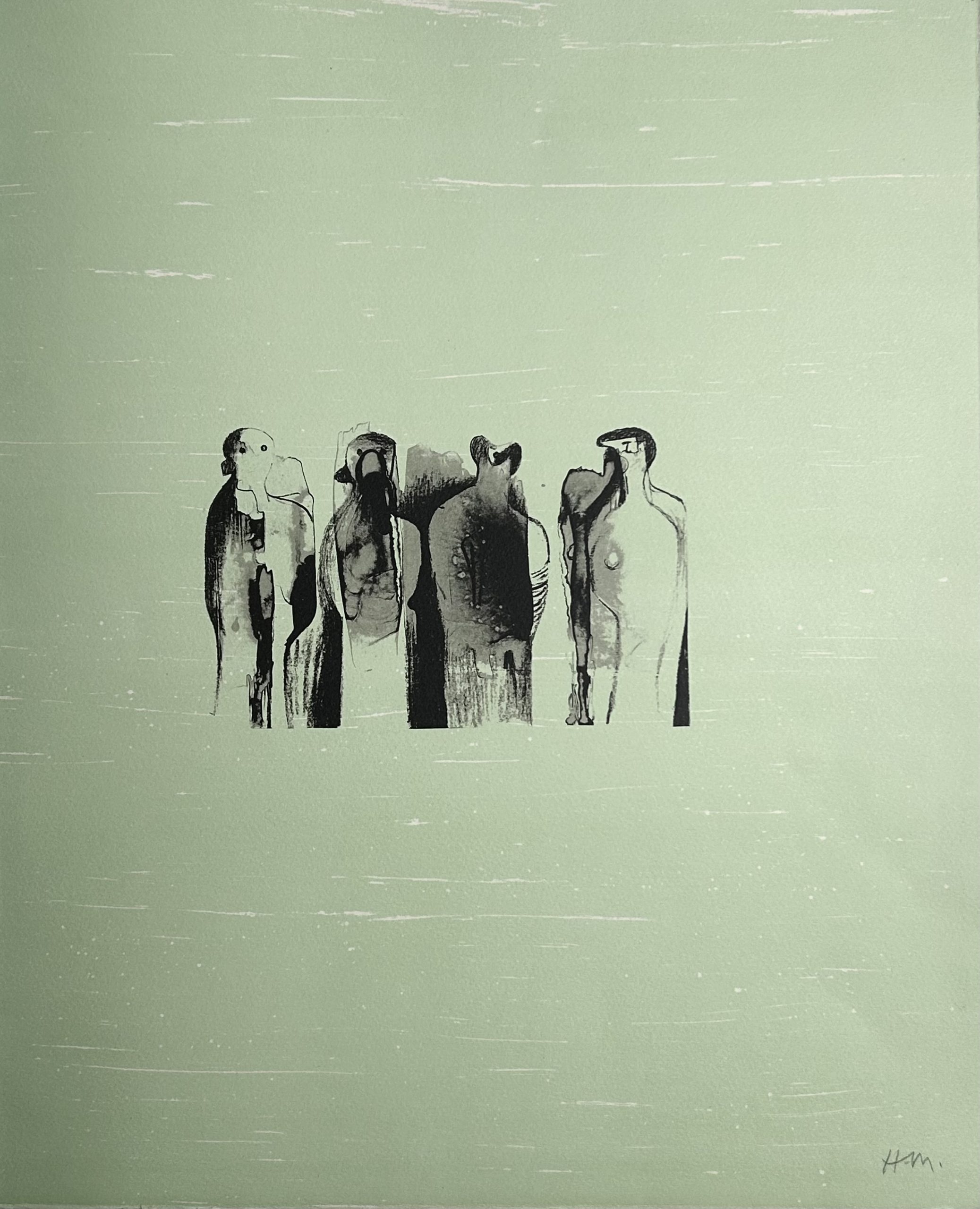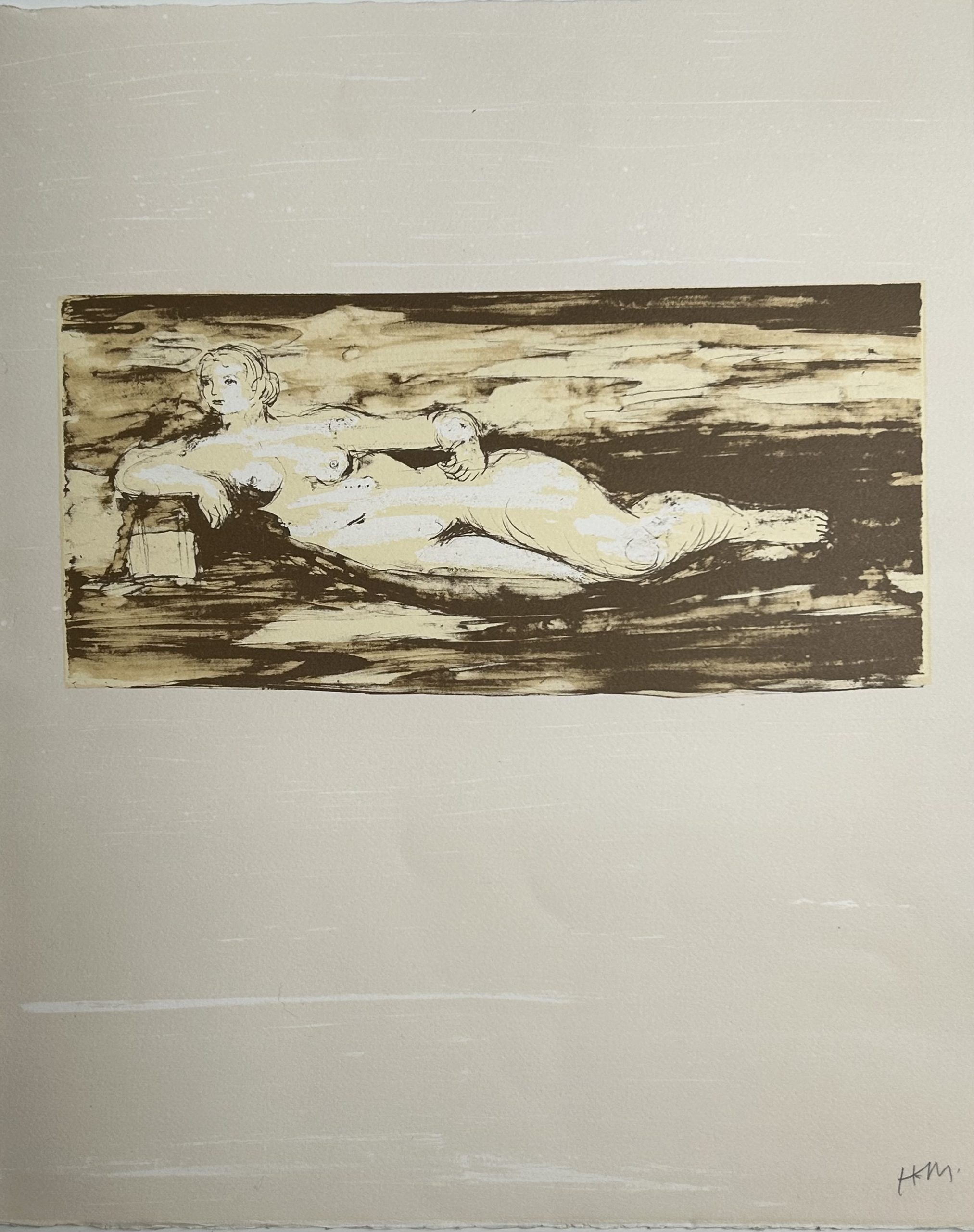 I have four lithographic prints created for La Poésie (Poetry) that were made between 1973-76. Moore was invited to illustrate a group of French poets selected by the French President at the time, Georges Pompidou. The poets selected included the literary greats including Racine, Gérard de Nerval, Victor Hugo, Charles Baudelaire, Stéphane Mallarmé and Paul Valéry. The idea was to develop illustrations that resonated with the literary quotations chosen. Themes that he had visited in his previous prints such as sculptural and stone forms, standing and reclining figures would recur. The lithographs were noted for their tonality and colour palette that have a slightly dream-like atmosphere and delicate quality, with the forms and figures given generous space. All these example are listed in Kramer.