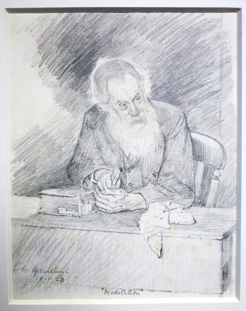 ‘Meditation’. Original drawing, signed and annotated, dated 1923, image measures 24cm x 19cm. Original study for the oil ‘Meditation’ (illustrated in last image). Very minor discolouration to small areas of sheet. Provenance: Bonhams, lot 232, November 27th, 2007
