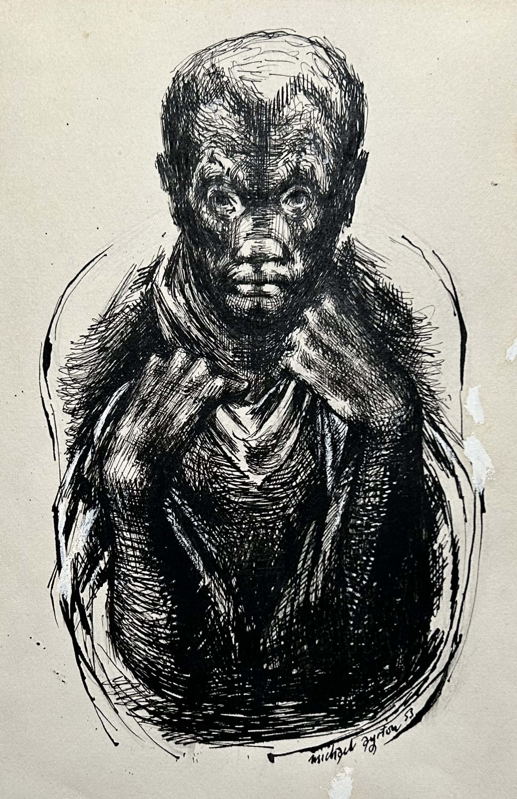 Signed ink drawing with gouache corrections to border. Measures 23cm x 16cm. Conservation mounted. Inscribed to border (under mount) to Jill, gifted in 1960. Jill refers to Jill Pomerance, daughter of Fay Pomerance who was an artist and close friend of Ayrton’s.