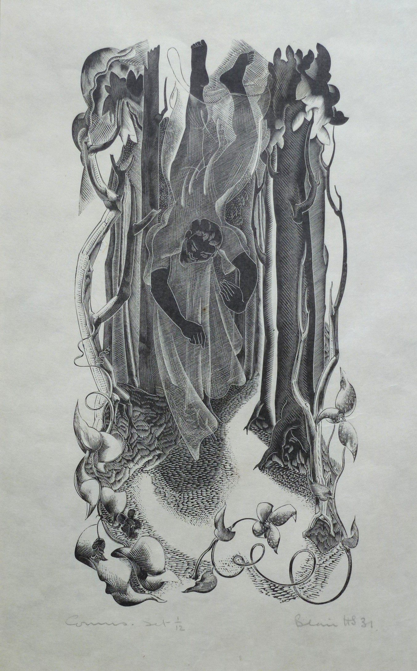 Pencil signed wood engraving, dated 1931, numbered 1/12. Block measures 18.5cm x 9.5cm plus borders. Conservation mounted.