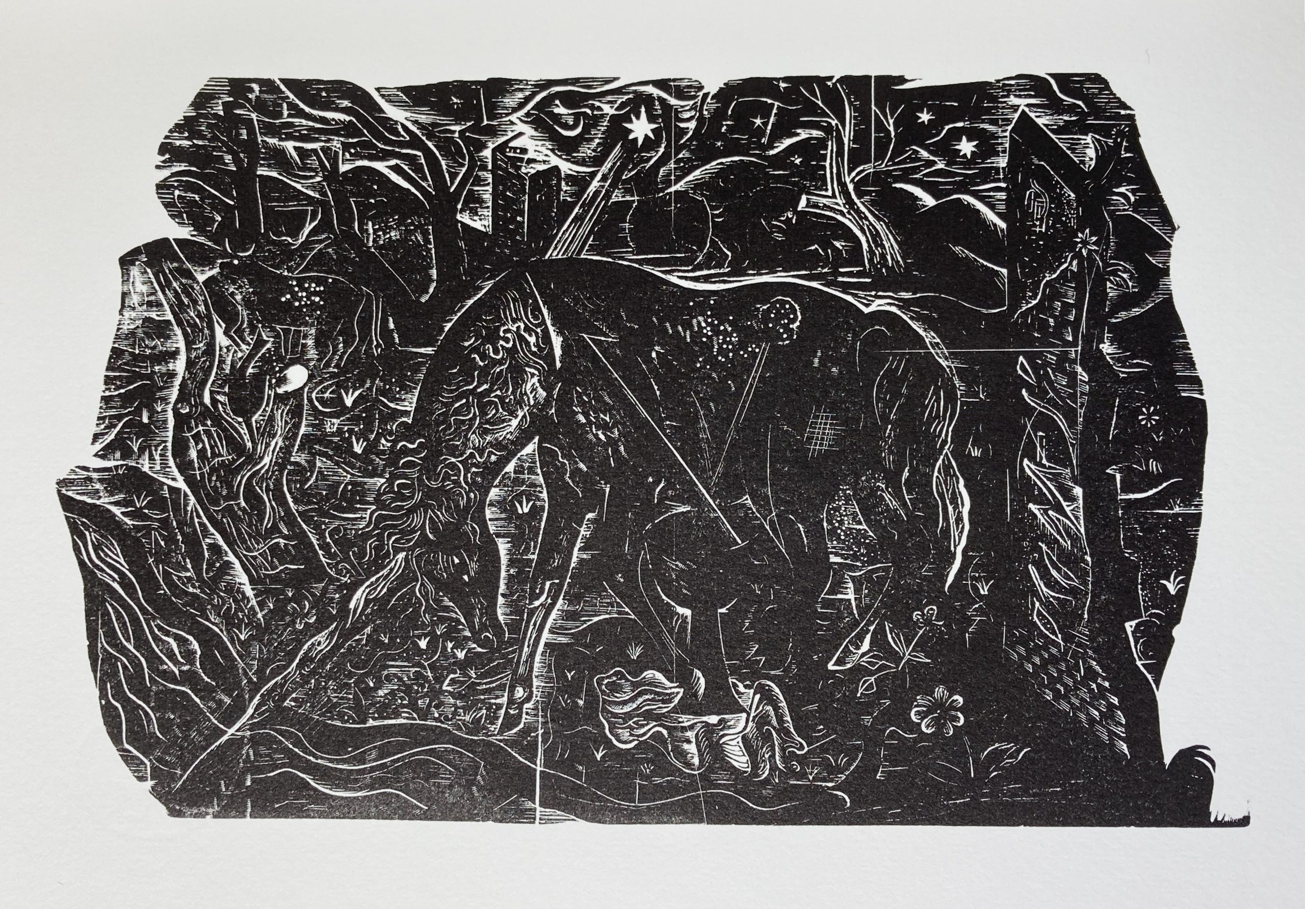 Wood engraving printed from block. Limited edition of 75, printed on hand-made paper by Clover Hill in 1981. Block measures 15.5cm x 24.5cm (blank verso). Mounted.