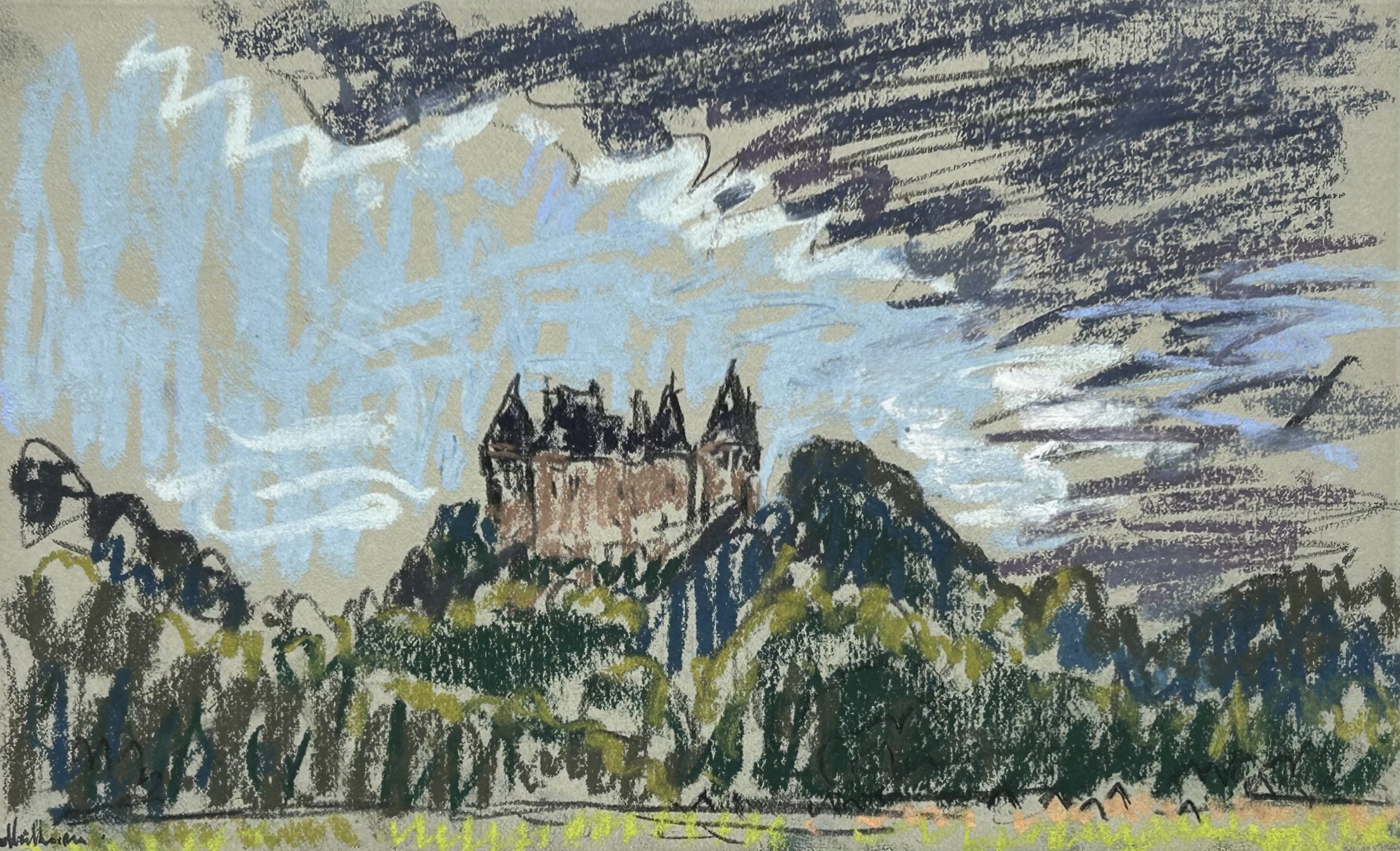 Signed pastel. Measures 13cm x 22.5cm. Conservation mounted.