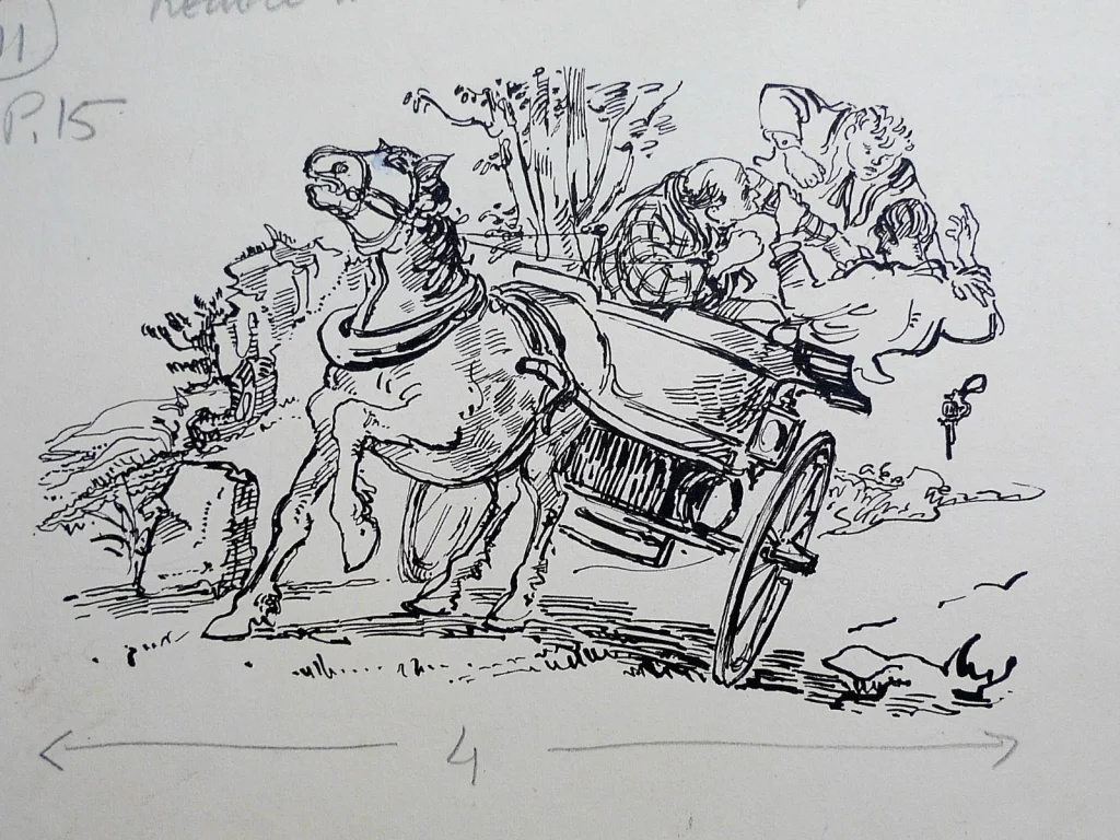 Original ink drawing for BBC publication, stamped and dated verso 1957. Sheet measures 6″ x 9″