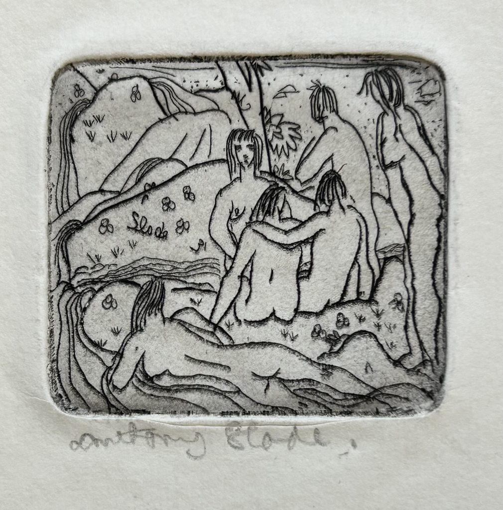 Pencil signed etching on hand made paper, printed by artist. Titled by artist to border. Plate measures 5cm x 5.5cm plus full borders. Conservation mounted.