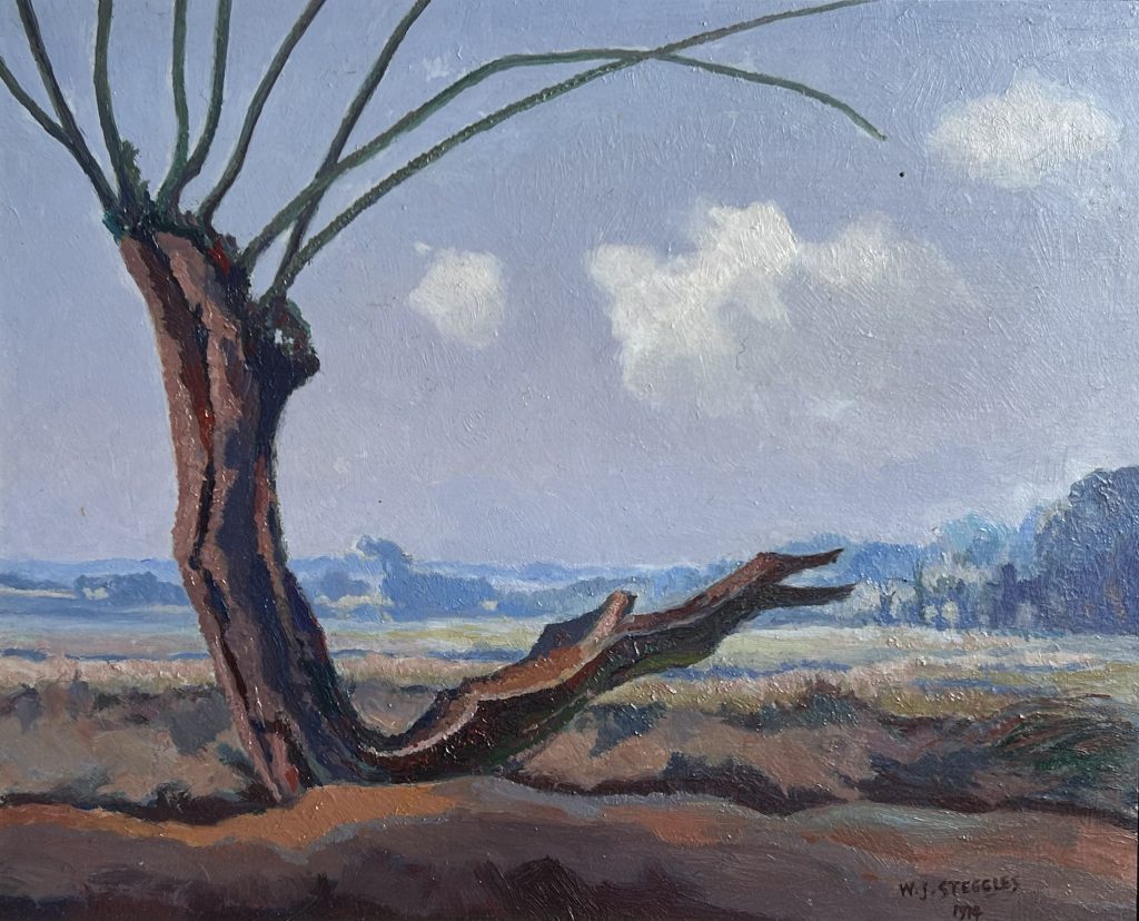 Signed oil on board, measuring 21cm x 25.5cm, dated 1974. Intriguingly, Steggles returned to watercolour study executed 12th July, 1931 (photocopy included), resulting in a span of 43 years between concept and completion. Thank you to Alan Waltham for his assistance in cataloguing this work. Provenance: Austin Desmond. Framed.