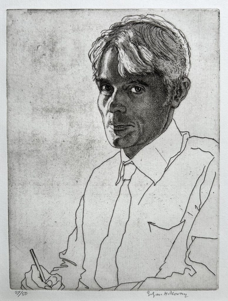 Signed etching, titled under mount. Plate measures 8″ x 6″ plus full borders. Robert Meyrick notes that this is ‘a practice plate motivated by an impending visit to America where Holloway had been commissioned to produce twelve etched portraits.’. Conservation mounted.