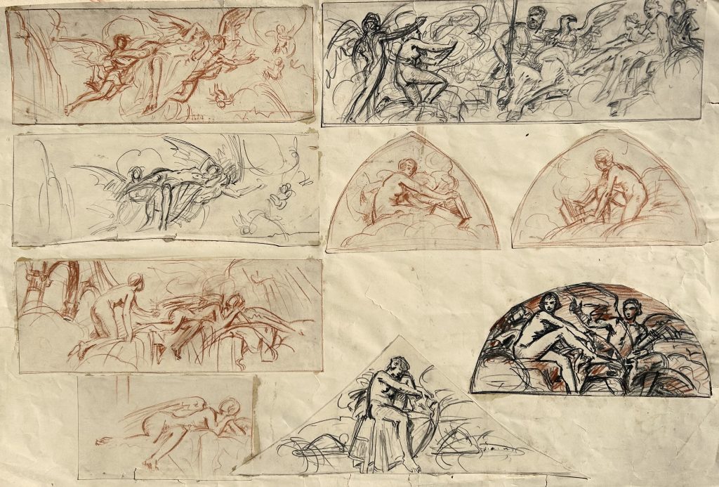 Nine studies in pencil and sanguin conte pastel, pasted down by the artist, overall measuring 33cm x 49cm. Estate stamped verso and numbered 678. Conservation mounted.