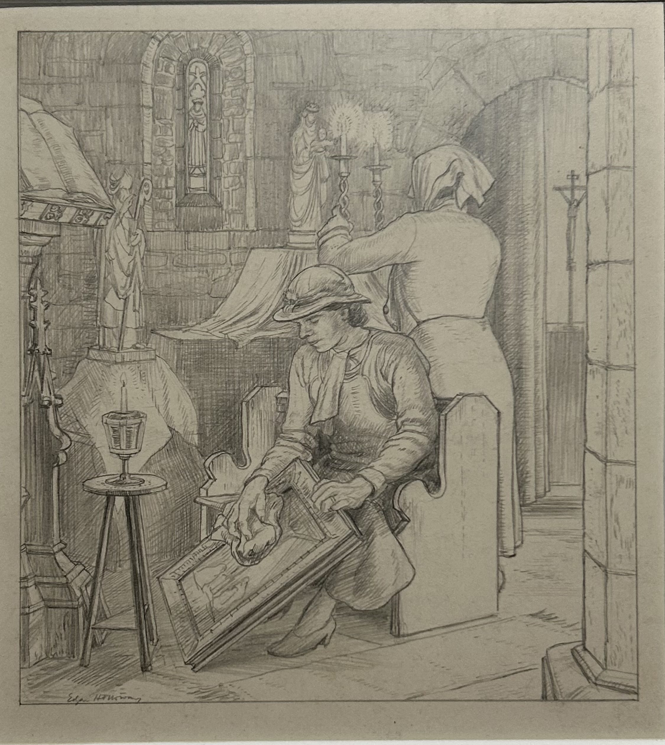 Completed signed pencil composition, ‘Spring Clean’ (precise title unknown), measuring 15cm x 14cm. Conservation mounted. The model closely resembles the artist’s mother.