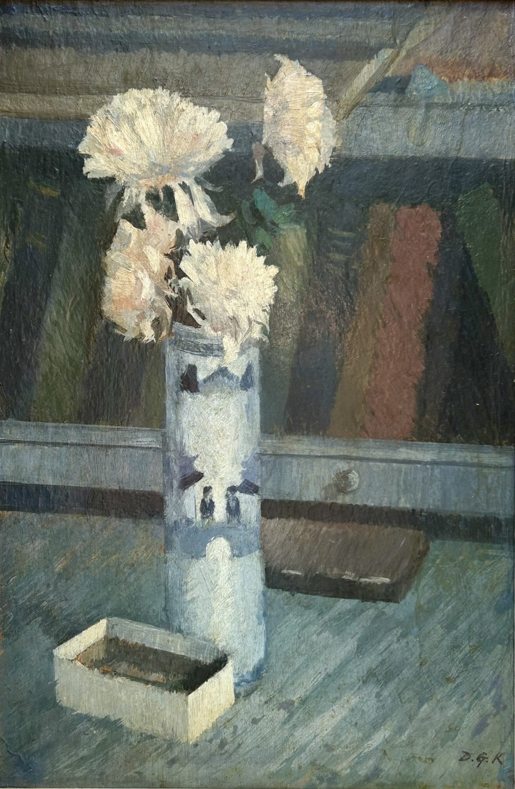 Oil on board, signed with initials bottom right. Image measures 35cm x 23cm. Presented in original frame.