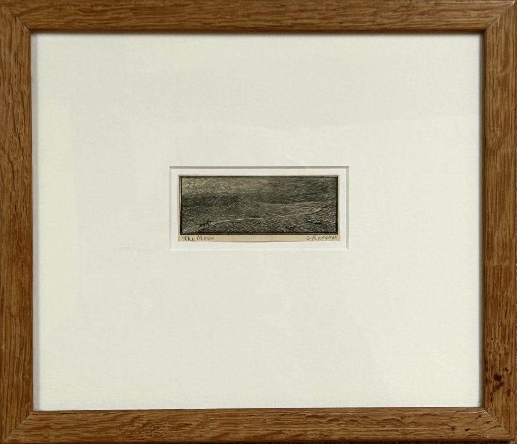 Signed wood engraving, edition of 20. Laid down. Block size measures 3.3cm x 8.9cm plus short borders. Framed.