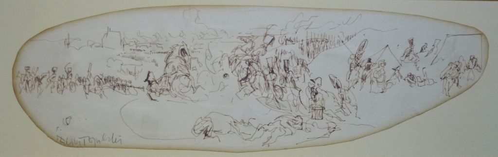 The original ink drawing for ‘War and Peace’, published 1971. Signed in pencil. Drawing measures 12cm x 39cm (irregular because shaped for publication). Mounted and framed. Please see ‘TOPOLSKI, Feliks’ under ‘OUR ARTISTS’ tab for more illustrations.
